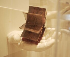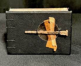 Book Materials: Arches Paper, Micron Brown #01 Pen, 17th Century Book Cover, Irish Waxed Linen Thread, Metal Plate, Doll Eye, Spool, Penny