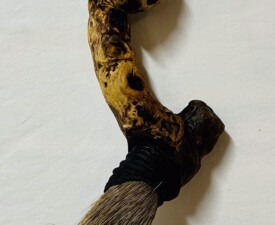 Materials: Driftwood, Animal Hair, Turkey Feather, Raffia, Clay Ferrule by Pamela Rogalski.