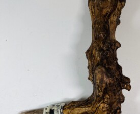 Ancient Watchman Stand: Materials: Grapevine, Polymer Clay, Acrylic Paint Size: 8" x 10" x 5" 2025 Brush: Materials: Bamboo, Deer Hair, Shell, Waxed Irish Linen Thread, Acrylic Paint. Size: 13" x 1.5" x 1.5" 2022. SOLD - Private Collection
